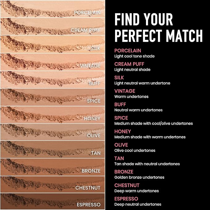 - PERFECT MATCH FOR EVERY SKIN TONE: Frankie Cosmetics Compact Powder is available in 12 drop-dead gorgeous shades so that you can find a perfect match for your skin tone: Cream Puff, Porcelain, Silk, Vintage, Buff, Spice, Honey, Olive, Tan, Bronze, Chestnut, and Espresso.