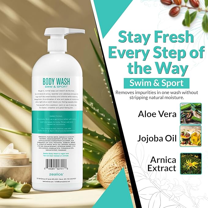 - Powerful Cleansing for Active Lifestyles: Zealios Swim & Sport Body Wash is specially designed for swimmers and athletes. It effectively removes chlorine, sweat, and salt buildup while keeping skin fresh and clean.