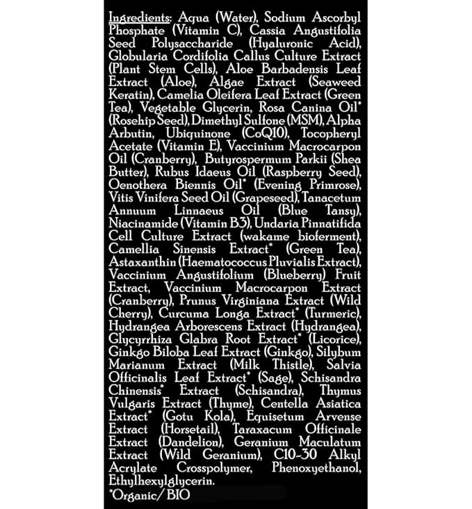 - Key Ingredients: Natural & Organic ingredients, including Plant Stem Cells, Vitamin C, MSM, hyaluronic acid and green tea.