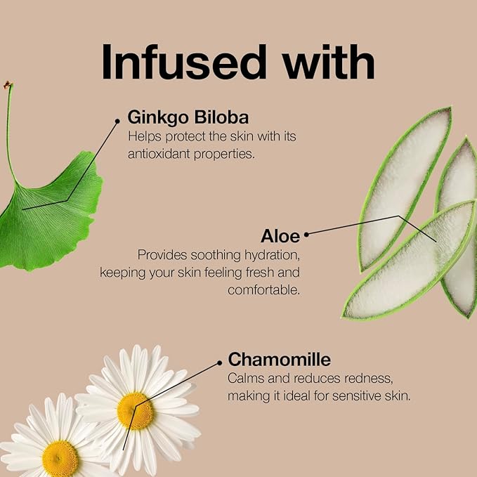 - BOTANICAL AND VITAMIN INFUSED COSMETICS: Infused with apricot, chamomile, ginkgo biloba, aloe (skin conditioning), coconut oil (skin softening) & ginseng