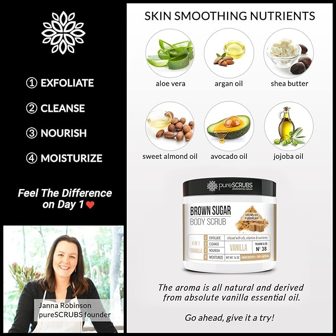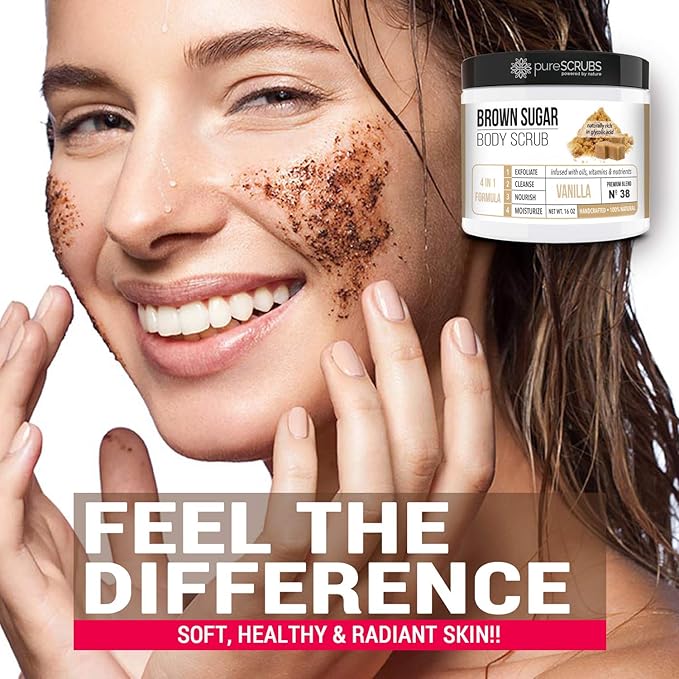 - GET ULTRA SMOOTH SKIN FAST - THIS WORKS! Our unique “4 in 1 Formula” does everything a body scrub should do and more. Pure brown sugar crystals infused with essential oils, nutrients and skin softeners helps to smooth away rough, bumpy, and uneven textures to instantly reveal your true soft, healthy and radiant skin. You will love the vanilla aroma!