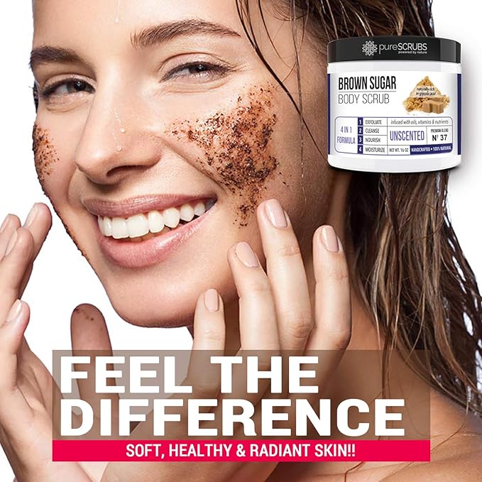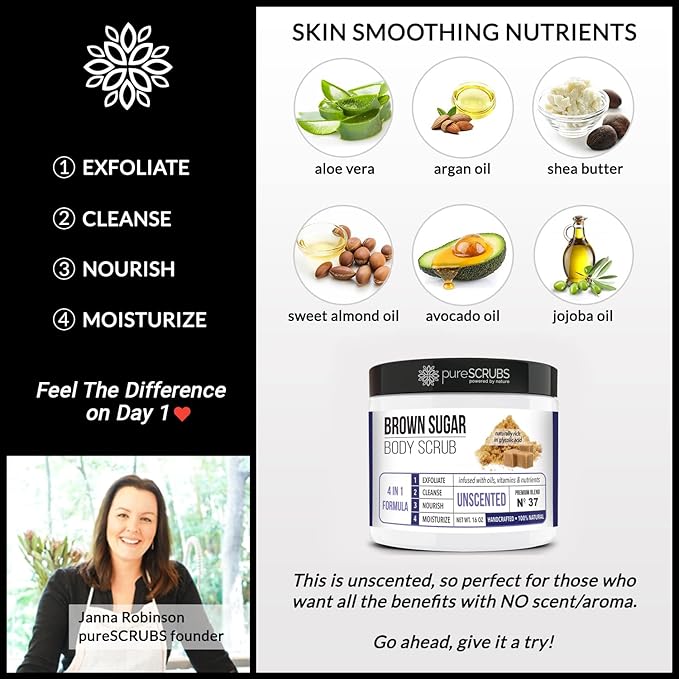 - GET ULTRA SMOOTH SKIN FAST - THIS WORKS! Our unique “4 in 1 Formula” does everything a body scrub should do and more. Pure brown sugar crystals infused with essential oils, nutrients and skin softeners helps to smooth away rough, bumpy, and uneven textures to instantly reveal your true soft, healthy and radiant skin. This is formulated to be an unscented scrub, perfect for those with sensitive noses. The only aroma is from the natural, raw ingredients themselves.
