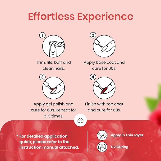 - Reminder: Cure under LED/UV light for 90-120 secs. Base and Top coat required.If gel feels thick or tacky, place in hot water for 1-2 minutes, remove from water and shake well.