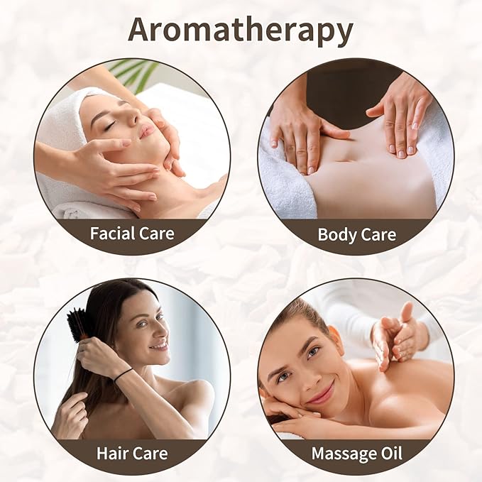 - 100% Pure organic jasmine, chamomile and sandalwood essential oil: no additives or fillers. Sandalwood essential oil extracted from Sandalwood's chipped heartwood and root, unique soft, rich, sweet, warm, woody aroma.