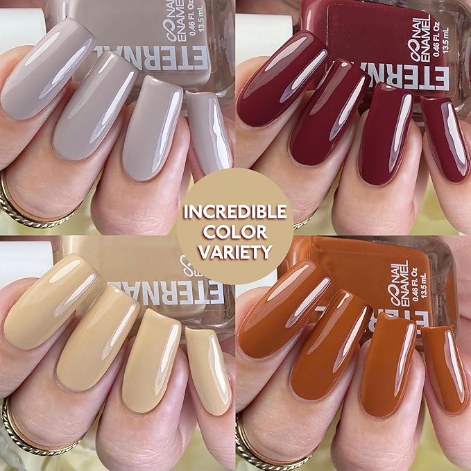 - ATTENTION GETTER NAIL LACQUER: This range of beige, to brown, to red-toned neutrals goes with absolutely everything—two words: must-have. Speak the language of passion, fire and confidence with these rich hues and show you sophisticated side! Our set includes grey nail polish, brown nail polish, beige nail polish and dark red nail polish.