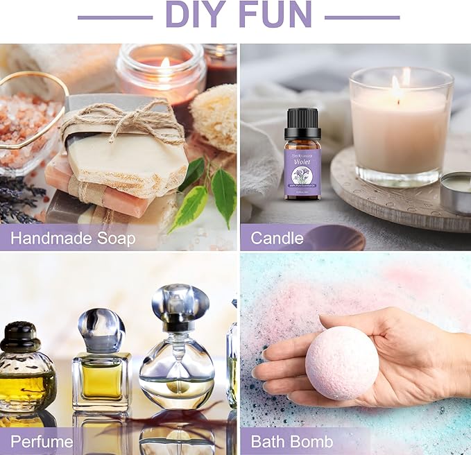 - Versatile Uses: Violet aromatherapy oils are used for aromatherapy,bath, hair care, saunas, air freshening, or soaps,etc.Suitable for diffuser, clean, massage, perfume, home care (bedroom, living room, bathroom, study room), office, outdoors, campground, yoga room, car and spa,etc.