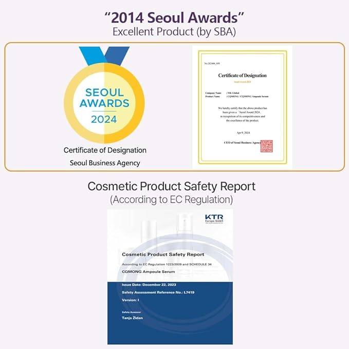 - [Safety] Safe to use on sensitive skin. Not including animal, harmful ingredients (Paraben, Formaldehyde, Sulfate, Oil, Surfactants, Artifical Fragrance & Color, Cruelty Free). * Produced by the largest cosmetics manufacturer(With ISO & CGMP Certification) in Korea. * Completed MoCRA Registration. * Cosmetic Product Safety Report according to EC Regulation (Safety Assessment Reference No. : L7419) * “2024 Seoul Awards” : Excellent Product (by SBA in Korea)
