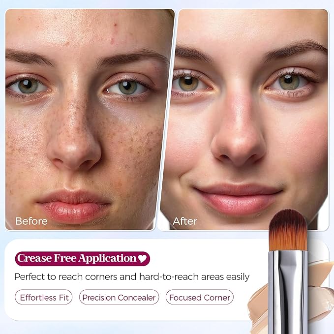 - 💖Concealer brush for eyebrows: The Precision Concealer Brush is a flat, Tapered-shaped with cruelty free synthetic fibers that is ideal for multi-use Makeup application of Liquid,cream and emollient-based products on the face and eyes.The flat head gives all over, even full coverage. The tapered bristles is perfect for the hard to reach, yet delicate areas of the face, such as under eyes, nose and mouth around. Get fantastic coverage and touch up perfection every time.