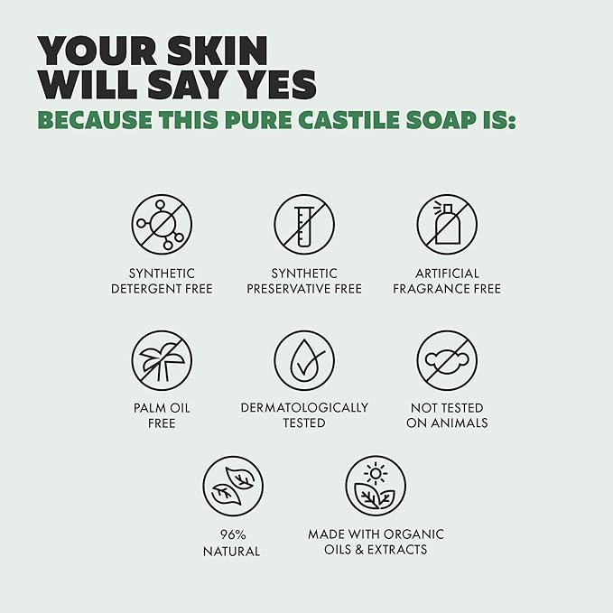 - NATURAL & VEGAN - With antioxidant-rich olive oil & organic coconut oil & shea butter, this pure Castile liquid soap, unscented, is 96% natural & made in Greece. Vegan & not tried animals, our pure Castille soap has no SLS or parabens & is the only one without palm oil.
