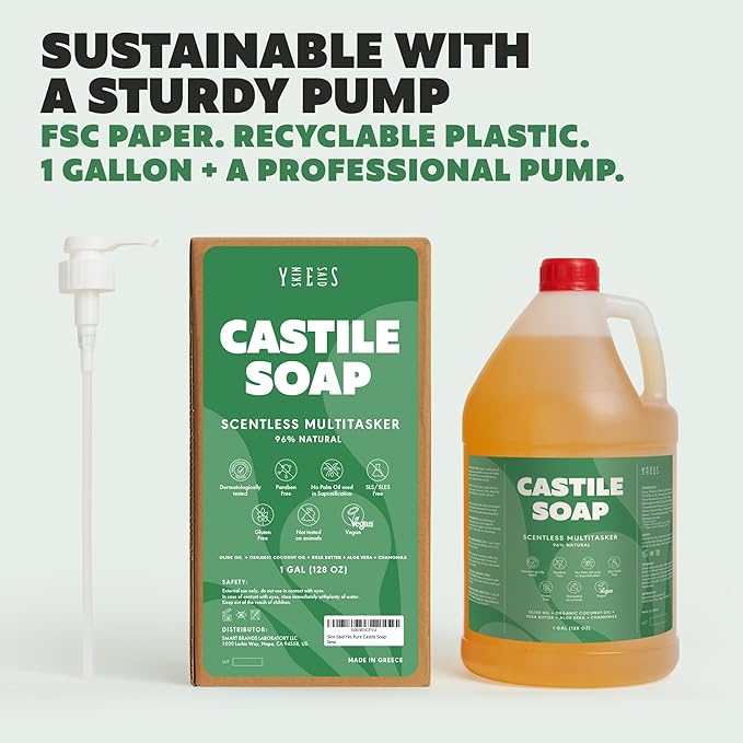 - SUSTAINABLE - We package our 1-gallon Castile soap refill with FSC paper & recyclable plastic. More soap per bottle means less waste in packaging. Dermatologically checked, it's as friendly to your skin as it is to nature!