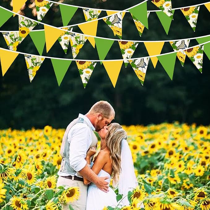 - Package Including:1 pack sunflower and butterfly printed fabric bunting banner garland in yellow and green colors, with 36pcs flags in 10M/32.8Feet. Flag Size: 5.5in width x 7in height
