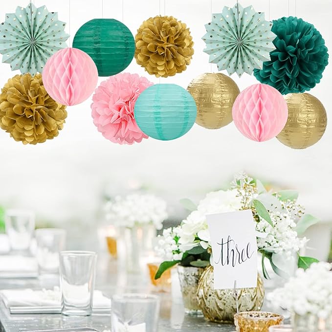 Sage-Green Pink-Gold Baby-Shower Party Decorations - 14pcs Teal Wedding Paper Lanterns Fan,Tissue Pom Poms Streamers,Honeycomb Balls,Birthday Bachelorette Engagement Bridal Decor Lasting Surprise