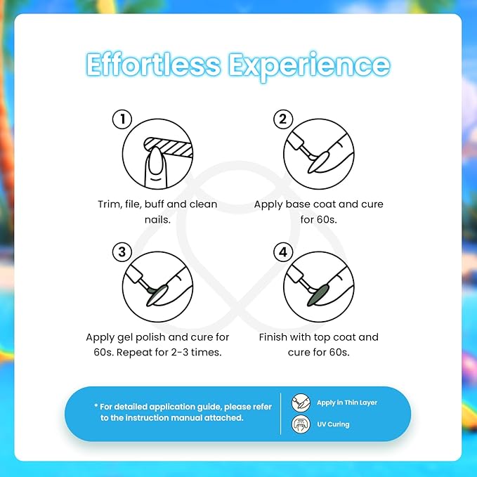 - 【Speed Curing with LED Nail Lamp】: The gel nail polish kit need to be cured under LED/U V light.Cure under LED for 90-120 secs. Base and Top coat required. If gel feels thick or tacky, please place in hot water for 1-2 minutes, remove from water and shake well.