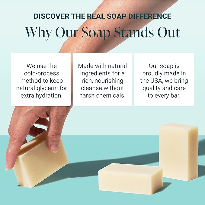 - THE COLD PROCESS DIFFERENCE: Traditional soap is made using the cold-process method, where fats and oils are used to create natural glycerin resulting in true soap (most commercial soaps on the shelves use synthetic ingredients that remove glycerin). The cold process allows all the natural soap goodness to stay intact and enhance our bars with their skin nourishing ingredients (Natural Glycerin, Raw Shea Butter, Natural Oils, Kaolin Clay)