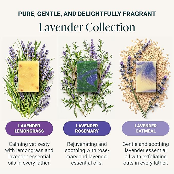 - LAVENDER COLLECTION SCENTED SOAP BAR: Features all 3 of our lavender soap bars - lavender with invigorating lemongrass, exfoliating oatmeal, and earthy rosemary essential oil. A cleansing experience that refreshes both body and soul. Crafted with raw shea butter, they creates a rich, foaming lather, leaving your skin feeling pampered and soft