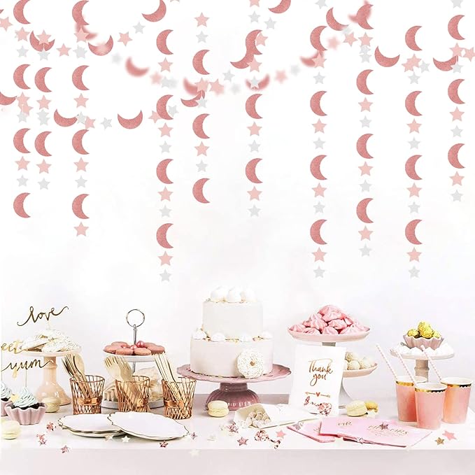 Pink Rose-Gold Moon-Star Party-Decorations Garland - 52Ft Twinkle Little Star Hanging Decoration Streamers Banner, Eid Ramadan Mubarak Decoration Birthday Wedding Baby Shower Party Decor Panduola