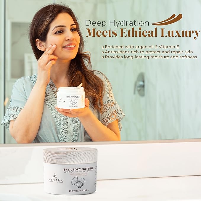 AZMERA Handcrafted Whipped Shea Body Butter – Unscented Moisturizer for Dry, Sensitive Skin with Argan Oil & Vitamin E – Vegan, Non-Greasy Whipped Body Butter for Women & Men – 8.82 oz