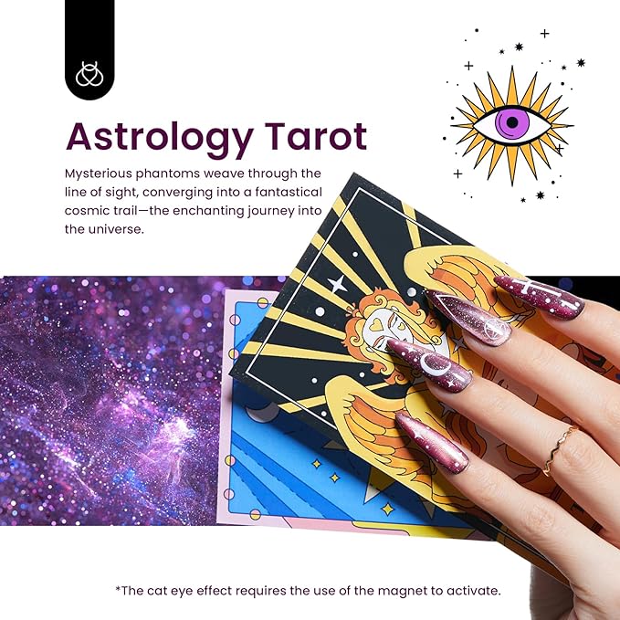 - 【Elegance Color Cat Eye Gel】Annual Special "Astrology Tarot Collection" gel nail polish set with a magnet: 2 Normal color gel, 2 Glitter gel, 2 Cat eye gel. 6 fantastic interstellar colors to create galactic designs on your nails. Only CL016 and CL020 are Cat Eye Gel. Color Number: d021-d020-d019-d018-d017-d016