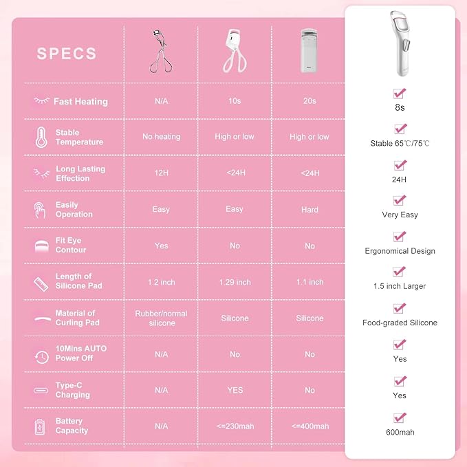 - 8S FAST HEATING: the temperature sensor pad of heat eyelash curler changes its color automatically to be white after pre-heating for 8 seconds. and there is beep "di-di" reminder you to use after the warm eyelashes curler has been fully heated up to right curling temputure. and the heated lashes curler will automatically power off after 10 minutes avoid any forgetting to turn off.