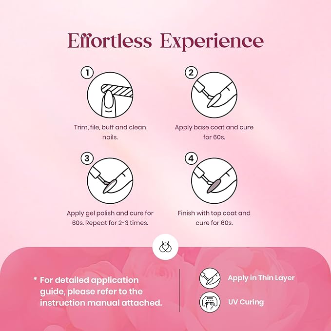- 【Sheer Nude Pink Gel 】Apply several layers to build up the color from clear translucent to solid opaque. Each layer, whether one, two, or three layers, creates a different effect. This milky white nude pink jelly gel nail kit is UV gel and need to be cured 60-120s. (Note: It is still sticky after curing and must be used with a base coat and top coat, which are not included and need to be purchased separately)