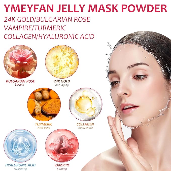- JELLY MASK BULK PACK: You will receive 6 jars of jelly mask powder, including Bulgarian Rose + Gold + Hyaluronic Acid + Turmeric + Collagen + Vampire. Each jar has a net weight of 650 G/23 Fl Oz. Provided for beauty salons and each jar can do 35-40 treatments.