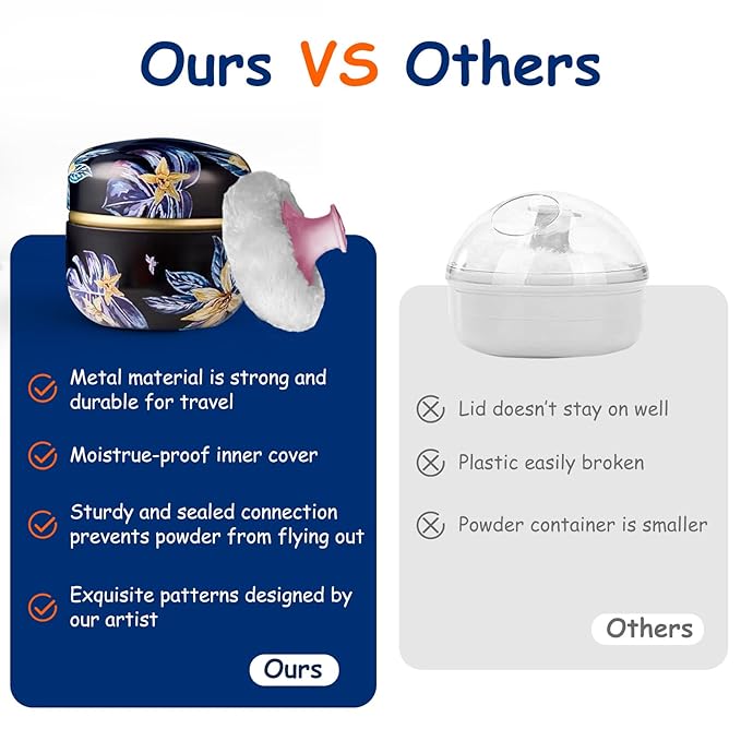 - GORGEOUS POWDER BOX: our powder case is made of tinplate, not easy to break and fade after being dropped, also can be used for a long time. the surface of the powder container has exquisite patterns designed by our artist, bring visual enjoyment.