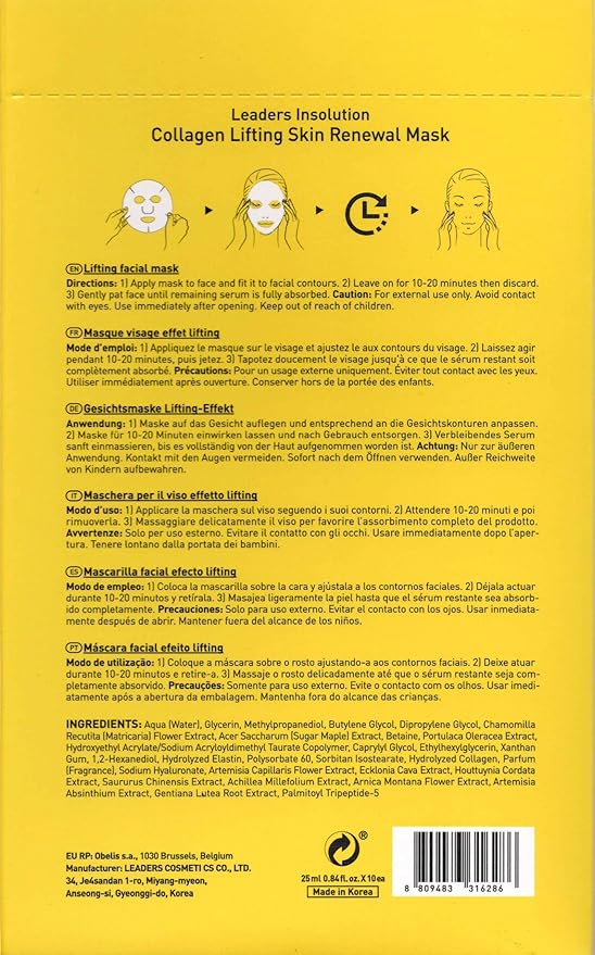 - LEADERS QUALITY ASSURANCE – Manufactured in South Korea by Leaders, a renowned skincare brand with its own R&D center and production facilities, each product undergoes rigorous testing to ensure the highest quality and effectiveness. Leaders Insolution Collagen Lifting Masks are easy to use: Cleanse and prep skin with toner. Remove mask from the pouch and fit to facial contours. Leave on for 10-20 minutes for optimal results. Gently massage extra serum into face and neck until fully absorbed.