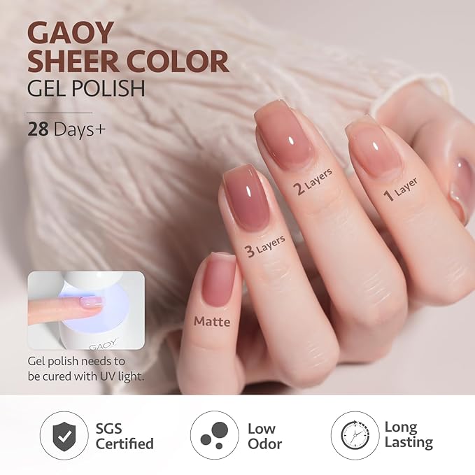 - Sheer Gel Polish: Apply several layers to build up the color from clear translucent to solid opaque.