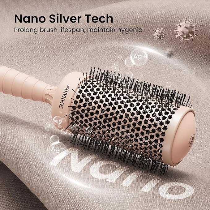 - Nano Silver Ion Infused Tech Round Hair Brush: AIMIKE nano round brush will emits negative ions while blow drying, which helps seal cuticles and reduce unwanted flyaways and frizz for a sleek shiny hair. And its nano silver tech decides its hygienic feature and longer lifespan
