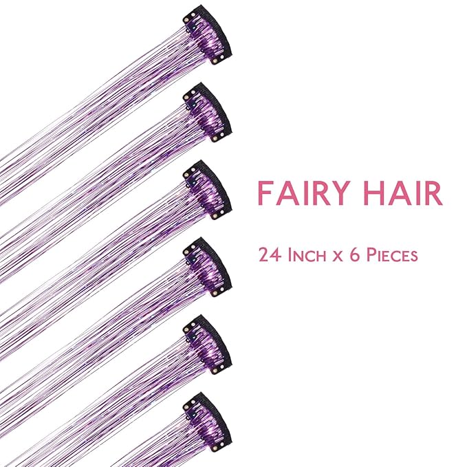 WENNALIFE Hair Tinsel Clip In for Girls Purple, 6pcs 24 inch Clips Tinsel Hair Extensions Clip in Colorful Glitter Clips Sparkle Fairy Hair Accessories for Kids