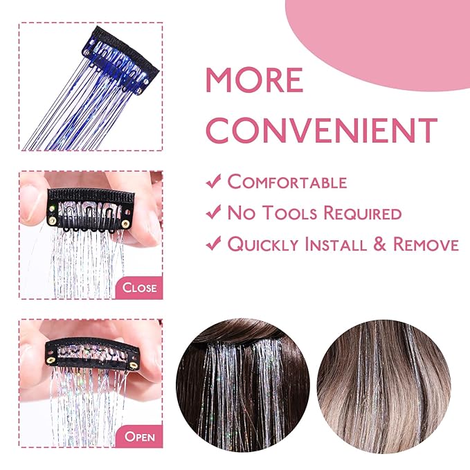 - 【Speedy Style Change】Unlike semi-permanent hair tinsel weaving or tip tech, clip-in hair tinsel allows you to change your hairstyle in 2 seconds. Just open the clip, put on your natural hair roots and clip. Trim to your own length, then cover the clip with your hair and you can get a seamless blend and glitter hair look. Clip in hair tinsel for a special occasion or a night out and remove it just as easily when you're done, without any long-term commitment.