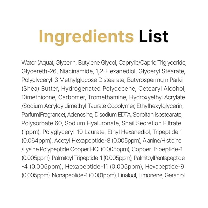 - Active Ingredients : Niacinamide, Glycerin, Adenosine, Snail Secretion Filtrate, Ceramide NP, Peptide 9