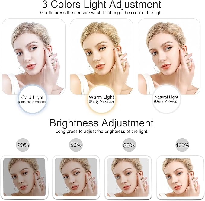 - PROFESSIONAL MAKEUP BAG WITH LED MIRROR: Travel cosmetic bag with a rechargeable lighted makeup mirror, it has 3 Color Lighting Modes (Cold Light, Natural Light, and Warm Light) & Brightness Adjustment, adaptable to different environments and make-up needs. Gentle press the sensor switch to change the color of the light, and long press to adjust the brightness of the light.