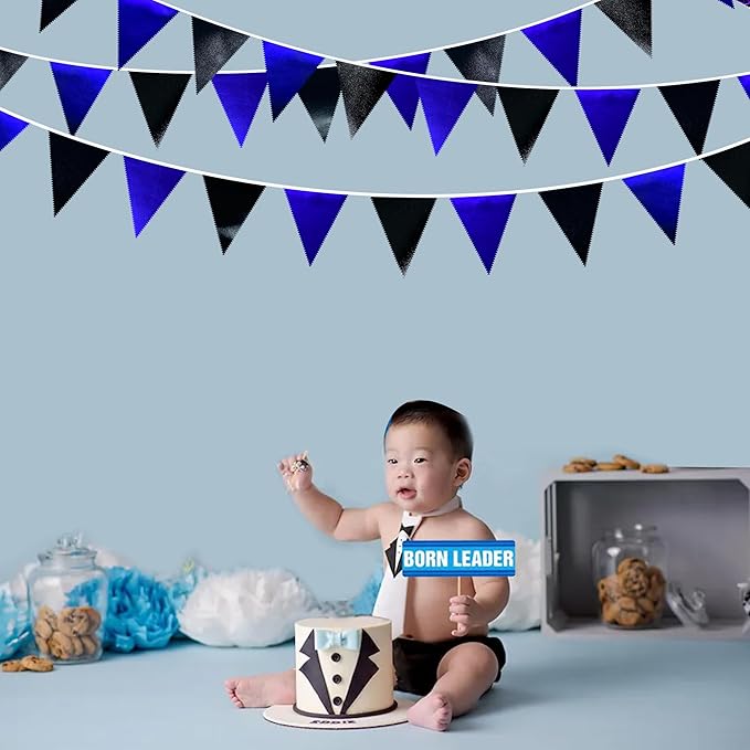 - Environmental Material - Our triangle bunting banner are made of double-sided black and royal blue metallic fabric cloth,Unique wavy neat cut,soft and comfortable touch.safe and odorless,washable and waterproof,durable and reusable.