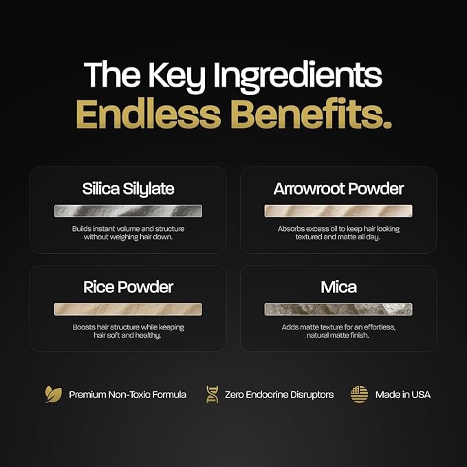 - QUALITY INGREDIENTS: Our Hair Texturizing Powder is 100% vegan and cruelty free. Made in The United States with no Sulfates, Parabens, or Phthalates. We only use 5 ingredients: Silica Silylate, Oryza Sativa (Rice) Starch, Silica, Mica, & Maranta Arundinacea Root Extract so you know exactly what you’re putting in your hair.