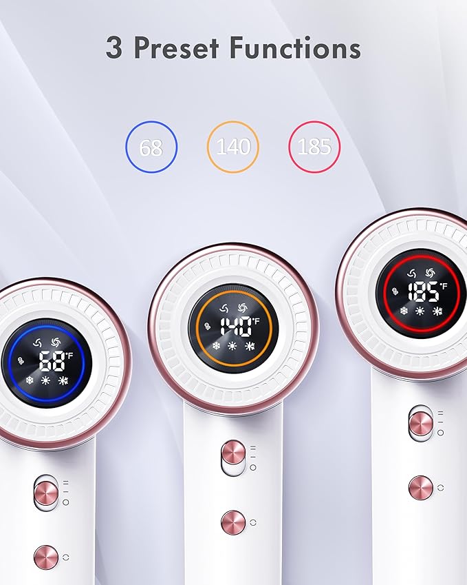 - 【HD display with adjustable temperature and wind speed】Enjoy the perfect balance of comfort and performance during your blow-drying routine. Our blow dryer features four heat settings ( Temperature / 68℉ / 140℉ /185℉/ Circulating Mode ) and two-speed settings, controlled by a high-performance chip control system. It regulates the heat, alternating both hot and cold airstreams to prevent overheating and potential hair damage.