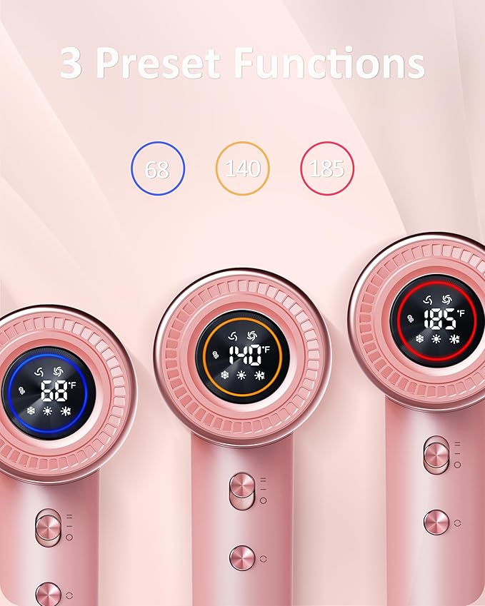 - 【HD display with adjustable temperature and wind speed】Enjoy the perfect balance of comfort and performance during your blow-drying routine. Our blow dryer features four heat settings ( Temperature / 68℉ / 140℉ /185℉ / Circulating Mode ) and two-speed settings, controlled by a high-performance chip control system. It regulates the heat, alternating both hot and cold airstreams to prevent overheating and potential hair damage.