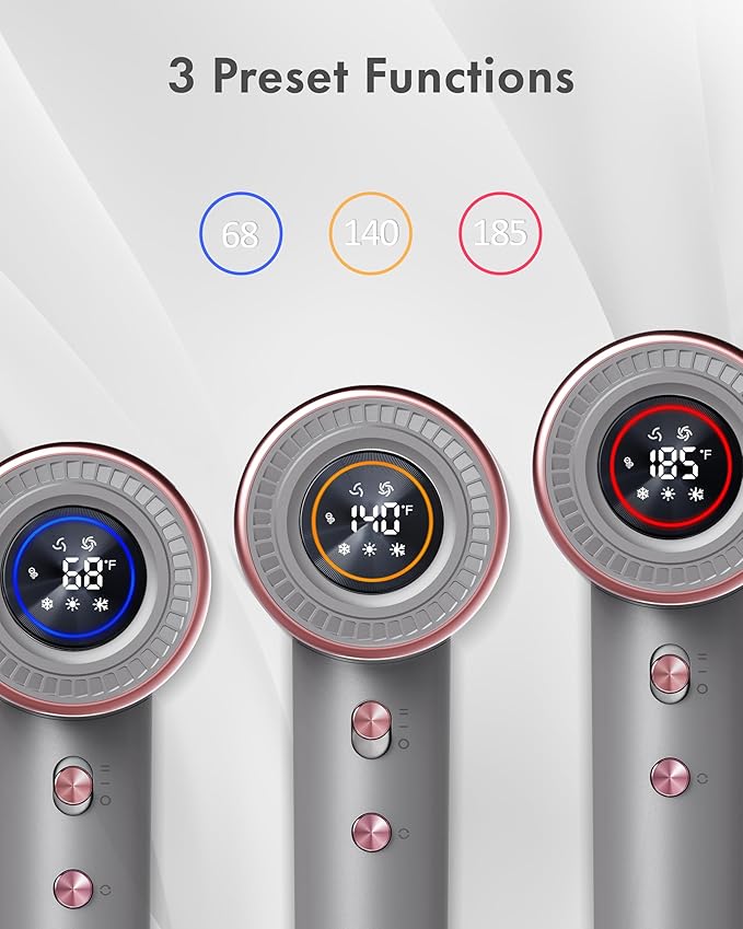 - 【HD display with adjustable temperature and wind speed】Enjoy the perfect balance of comfort and performance during your blow-drying routine. Our blow dryer features four heat settings ( Temperature / 68℉ / 140℉ /185℉ / Circulating Mode ) and two-speed settings, controlled by a high-performance chip control system. It regulates the heat, alternating both hot and cold airstreams to prevent overheating and potential hair damage.