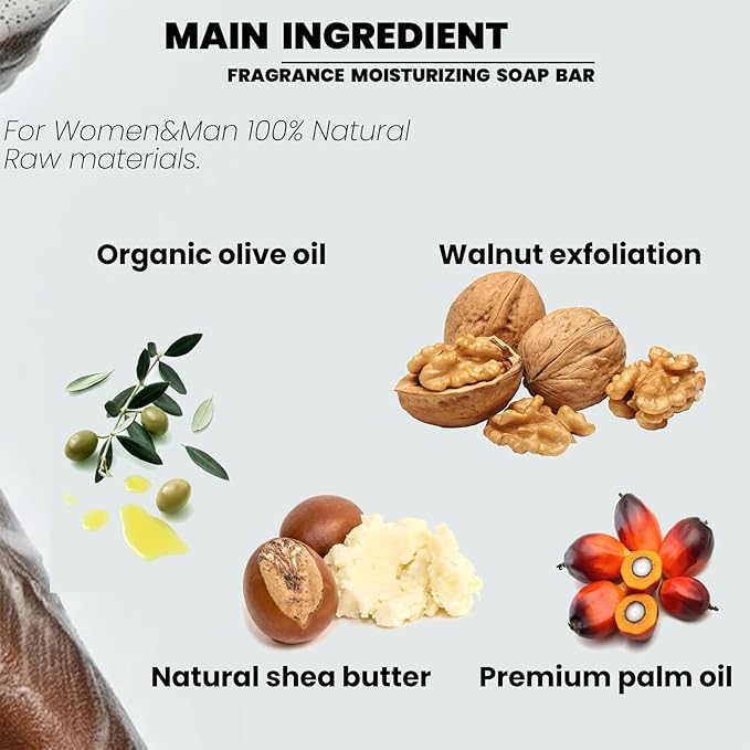 - MALAYSIA SOAP BASE :Extracts from tropical plants,Enriched with premium natural and clean ingredients, our botanical body care soaps are WITHOUT synthetic fragrances, making it the safe and ideal bar soap for sensitive skin conditions.true exfoliating walnut powder soap. Feel relaxed & comfortable after the shower.