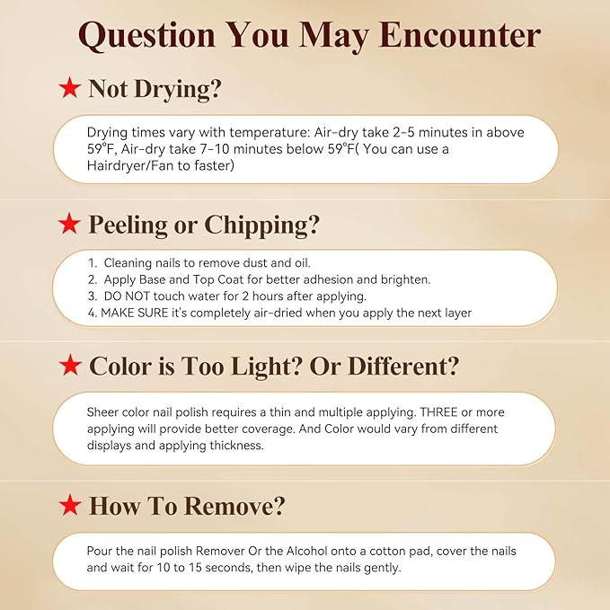 - Warm Tips: It is recommended to apply a base and top coat to protect the lasting effect of nail polish better; 1 coat of nail polish takes 3 minutes to air dry, and 2 coats will take 10 minutes, you can speed it up with a Hairdryer or Electric Fan