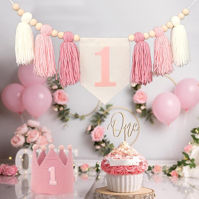Pink Baby Girl 1st High Chair Banner Wood Bead Tassel Garland Crown Hat Wooden Cake Topper Birthday Party Decorations