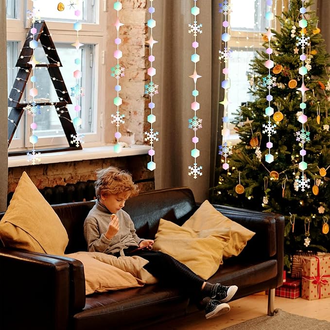 - PACKAGE CONTAINS: This set has four iridescent holographic snowflake paper garland,the length of each strand is 4 meters/13 feet, the total length is 16 meters/52 feet.The snowflake size 2.8IN,quadrangle size2.8IN,hexagon size1.6IN and 1.2IN.