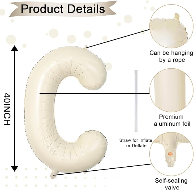 - Cream White Letter C Balloon 40 Inch: Includes 1pc giant beige "C" letter balloon and 1 straw for easy inflation and deflation. Our elegant big beige balloons are perfect for personalized parties. With 26 letters (A-Z) and numbers (1-9) available, you can mix and match to fit your theme.