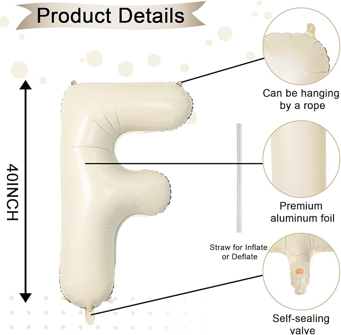 - Cream White Letter F Balloon 40 Inch: Includes 1pc giant beige "F" letter balloon and 1 straw for easy inflation and deflation. Our elegant big beige balloons are perfect for personalized parties. With 26 letters (A-Z) and numbers (1-9) available, you can mix and match to fit your theme.