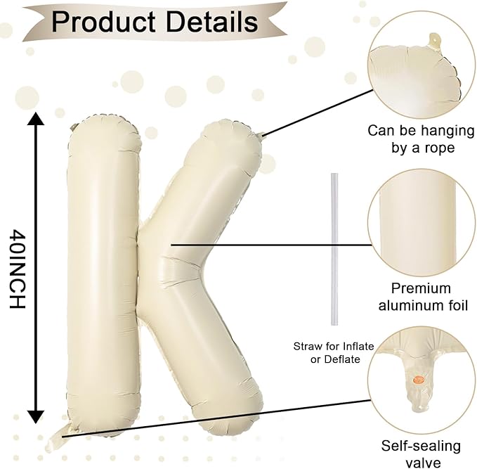- Cream White Letter K Balloon 40 Inch: Includes 1pc giant beige "K" letter balloon and 1 straw for easy inflation and deflation. Our elegant big beige balloons are perfect for personalized parties. With 26 letters (A-Z) and numbers (1-9) available, you can mix and match to fit your theme.