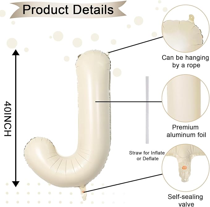 - Cream White Letter J Balloon 40 Inch: Includes 1pc giant beige "J" letter balloon and 1 straw for easy inflation and deflation. Our elegant big beige balloons are perfect for personalized parties. With 26 letters (A-Z) and numbers (1-9) available, you can mix and match to fit your theme.