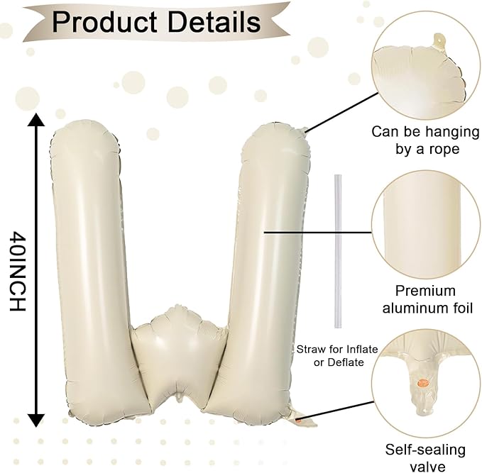 - Cream White Letter W Balloon 40 Inch: Includes 1pc giant beige "W" letter balloon and 1 straw for easy inflation and deflation. Our elegant big beige balloons are perfect for personalized parties. With 26 letters (A-Z) and numbers (1-9) available, you can mix and match to fit your theme.