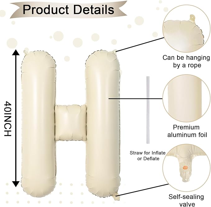 - Cream White Letter H Balloon 40 Inch: Includes 1pc giant beige "H" letter balloon and 1 straw for easy inflation and deflation. Our elegant big beige balloons are perfect for personalized parties. With 26 letters (A-Z) and numbers (1-9) available, you can mix and match to fit your theme.
