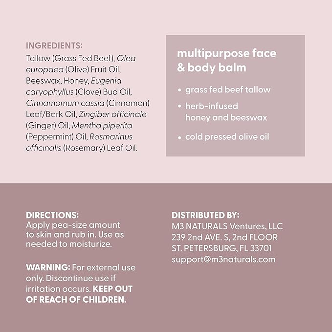 - Blendable & buttery consistency you'll love! Our multipurpose & easy-to-use beef tallow for skin & face is perfect for on-the-go-moisturizing. Apply a pea-sized amount to skin & rub in—You wouldn't even need too much for the balm to work. M3 Naturals is a brand that contains products that contain natural ingredients and other ingredients.