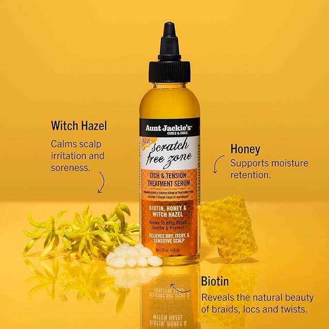 Aunt Jackie's Braid + Twist Collection Scratch Free Zone Itch & Tension Treatment Serum – Relieve Dry, Itchy Scalp with Witch Hazel, Biotin, and Honey – 4 fl oz